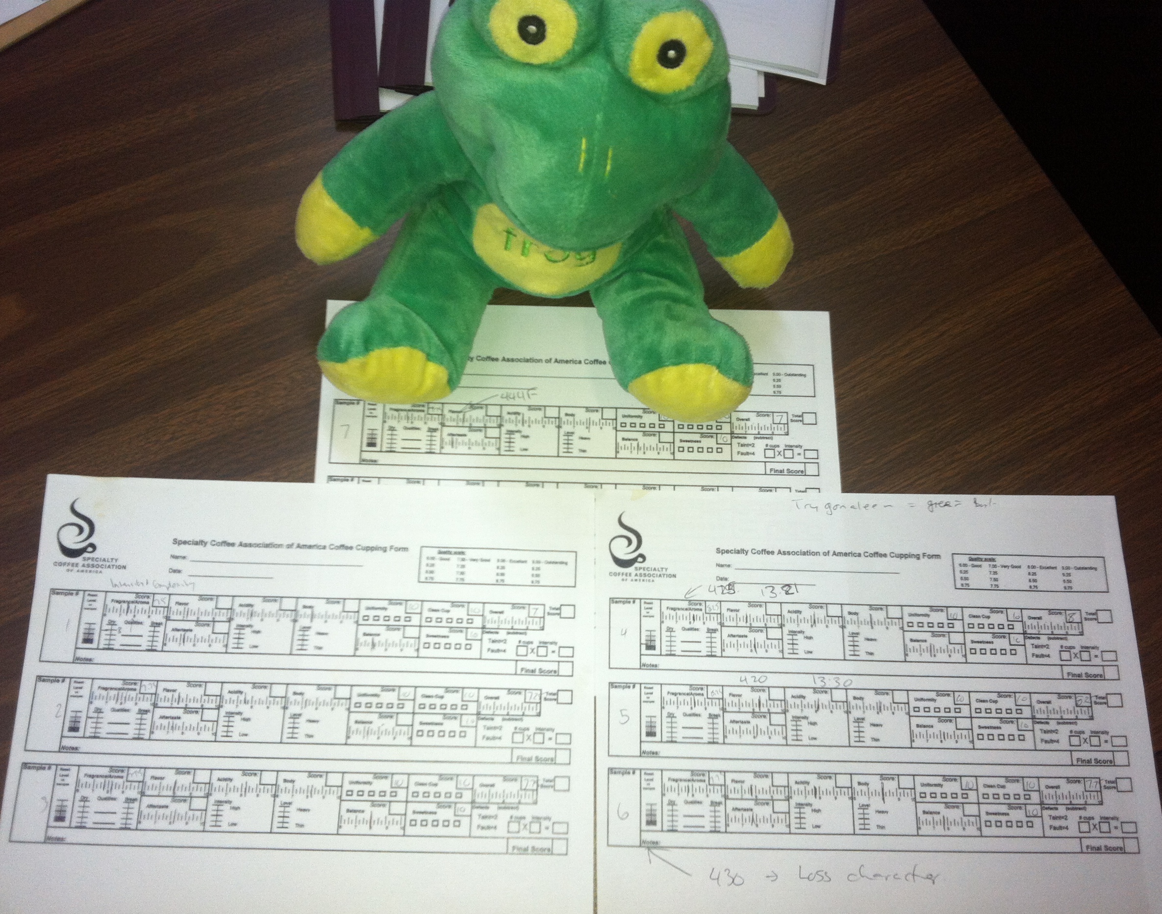 We were given the SCAA cupping forms to evaluate the different roast profiles. Which resulted in the first two and the last one being excluded first. The first too were a little green, and the last one the unique flavours of the coffee had been destroyed by going to far in the roast like an Italian or French roast. In the end the coffee that had just gone past 1st crack, and just before 2nd crack at 420°F (the 4th roast) or 425F (the 5th roast).