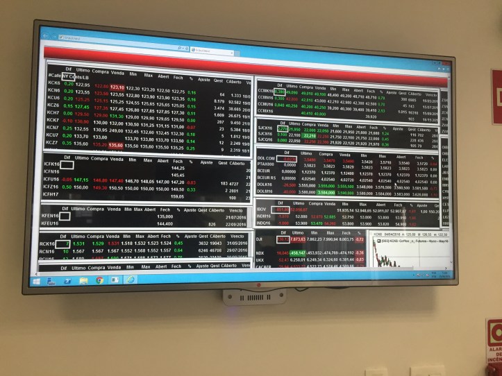 After we visited the trading desk which is the other side of the contracts in coffee. When they sell the coffee the contracts are signed with the base point and then added premiums. Munro Lúcio dos Santos does this. He watches all the markets all the time to determine pricing and contract offerings. I forgot that for every seller in the futures commodity market there has to be a buyer and this is him for Expocaccer.