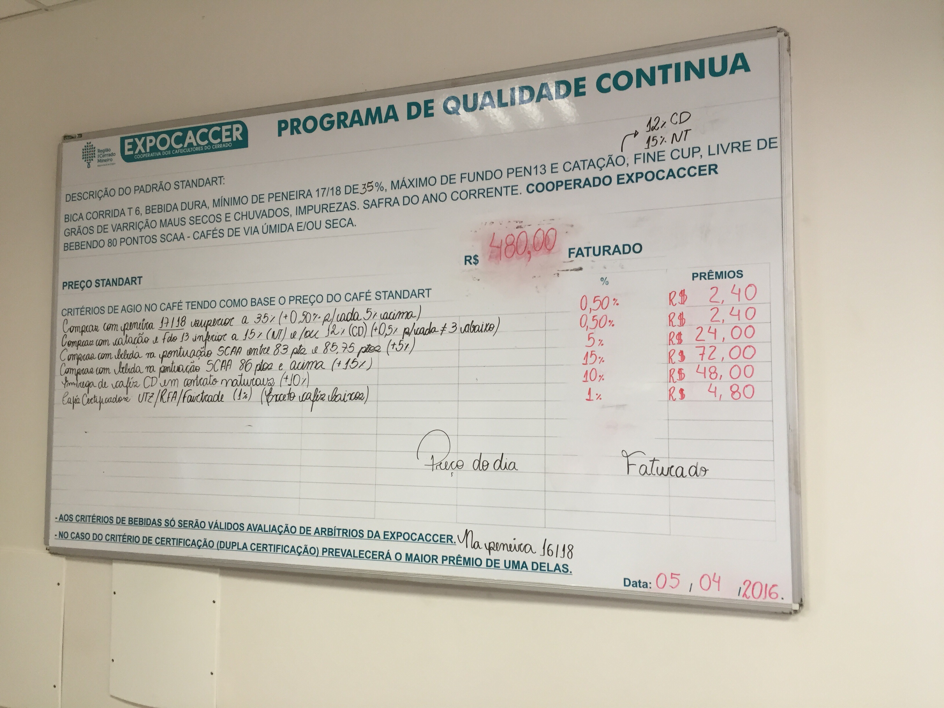 The producers bring the coffees in 1 tonne bags, and a sample from each bag is selected t determine quality. The coffees are then size sorted and any screens that are 16+ or PeaBerry (they call that mocha here) are cupped and graded. the producers receive premiums depending on how much of each they produce, some listed below: