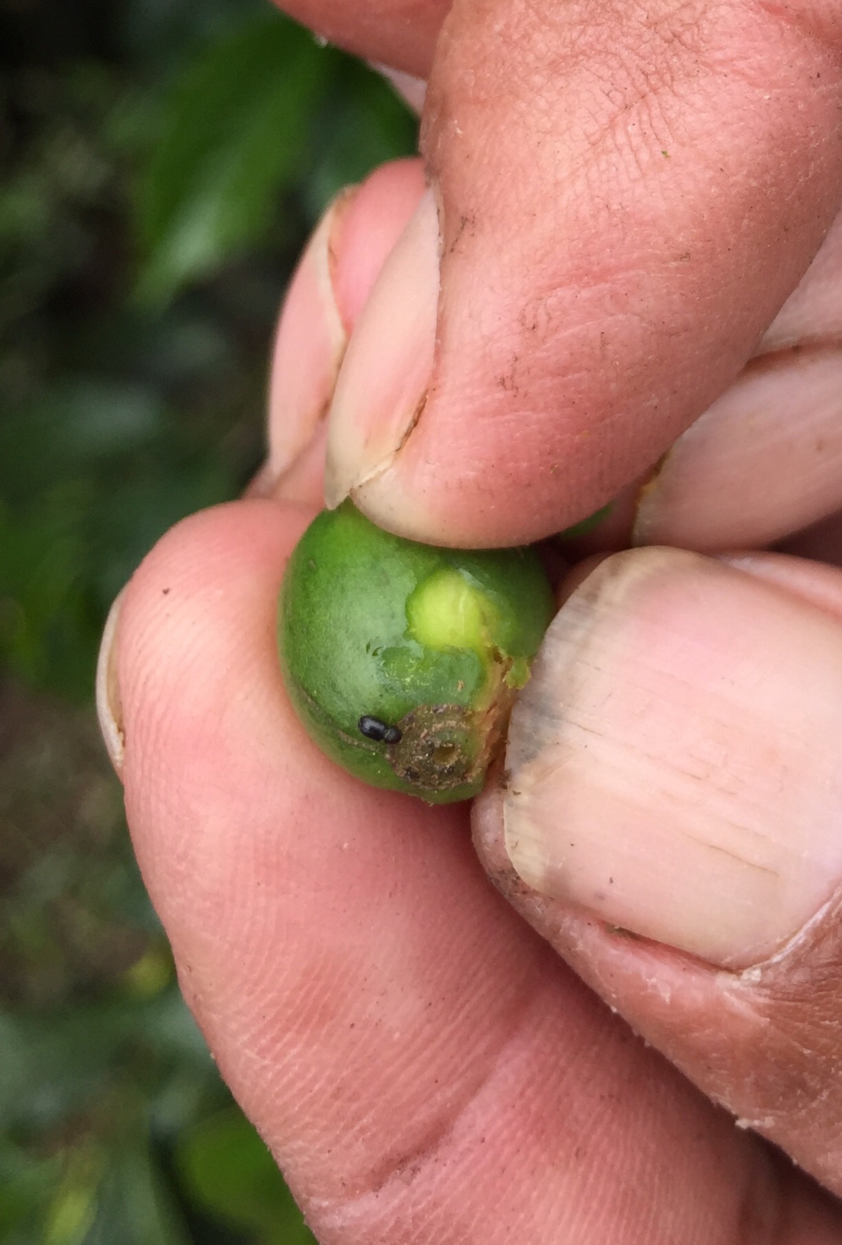 This is a common and very damaging pest, we saw one (see pic) and also saw the damage it can do. the little beetle love caffeine so it bores into the cheery and eats the inside of the seed. If you pic this coffee and open it the beabs are there but have nothing inside.